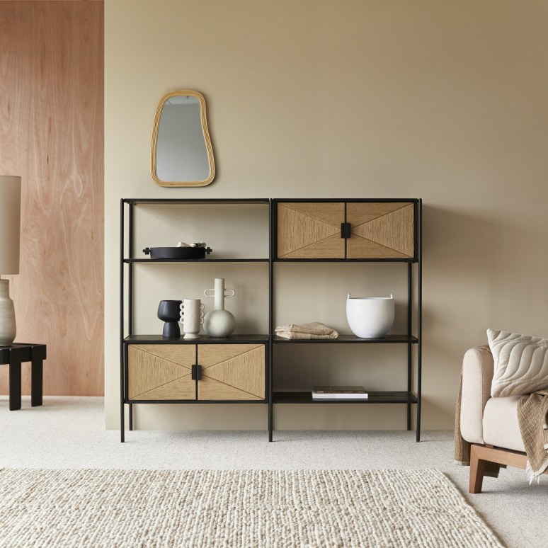 - Materiaalmix: massief mangohout en natuurlijke vezels
